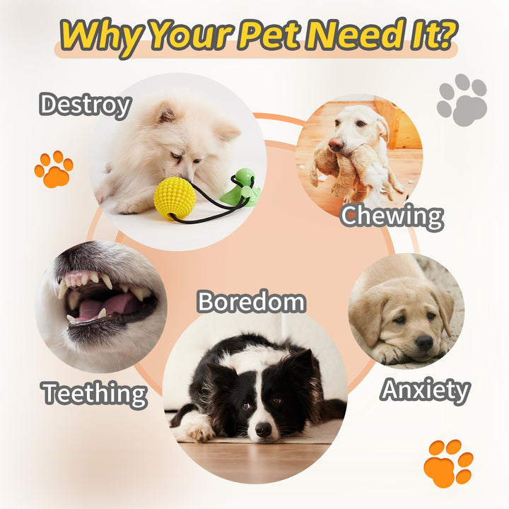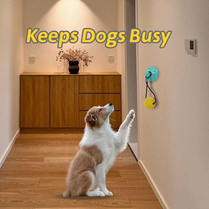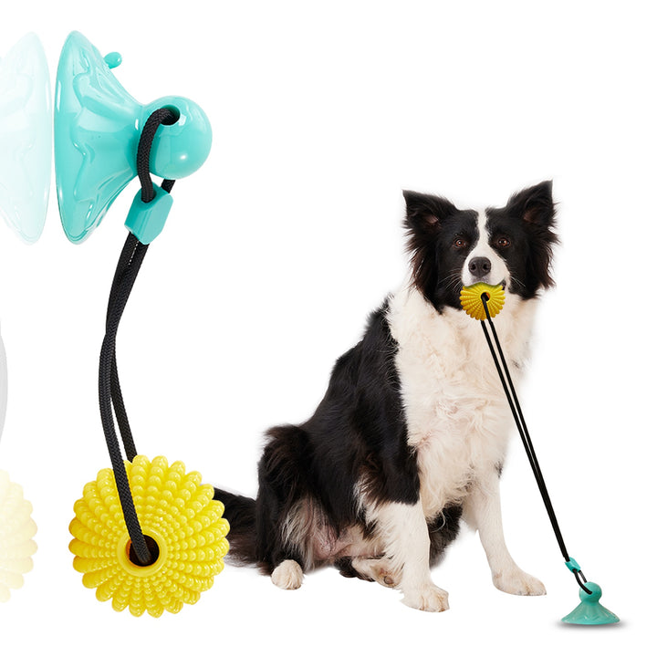- Dual-function toy: suction cup + rope + chew ball
